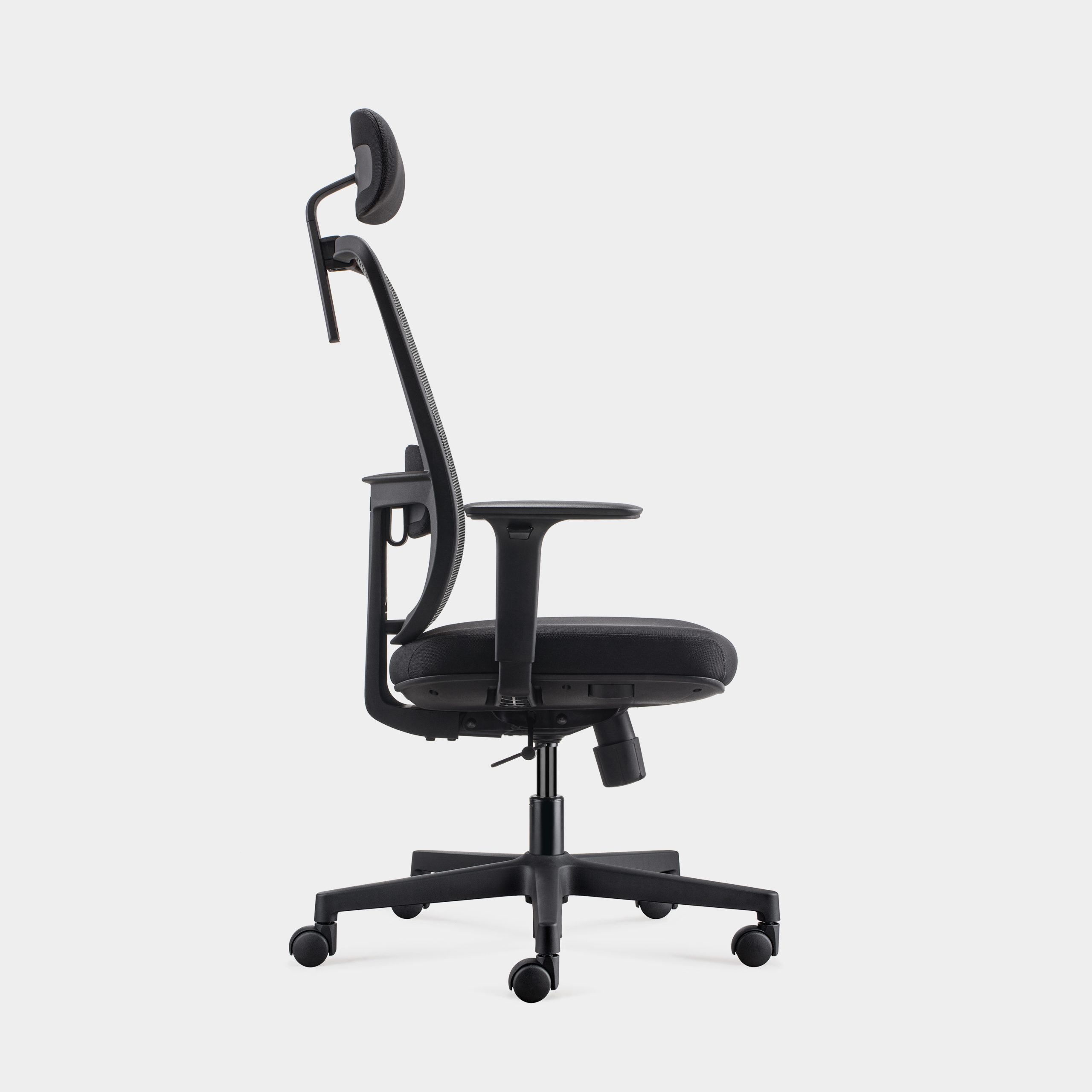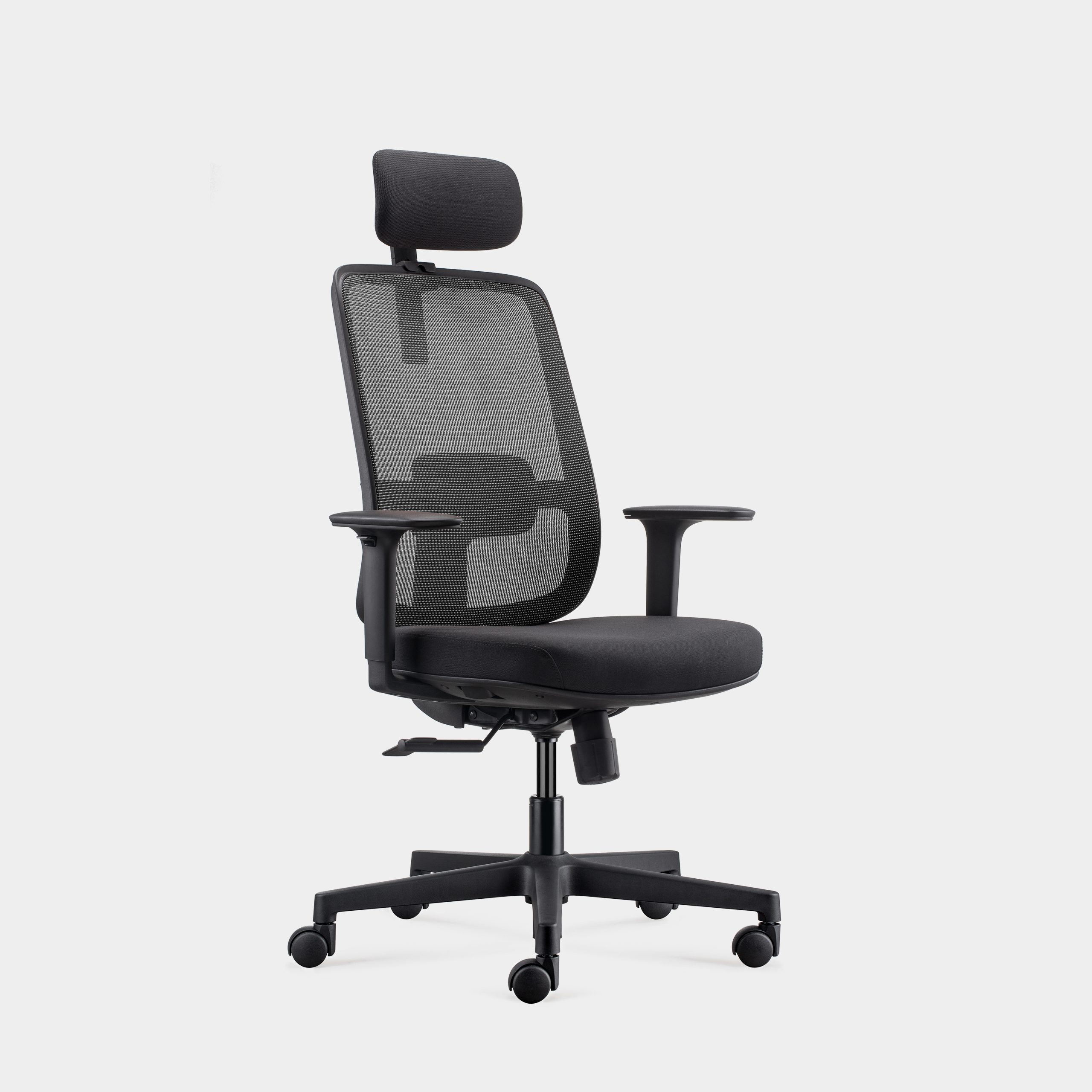Totto, uma cadeira de escritório confortável e funcional. Com apoio de cabeça estofado, ajustável em altura e ângulo, apoio lombar e braços reguláveis, proporciona um suporte