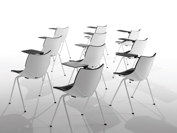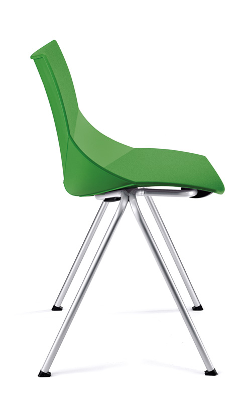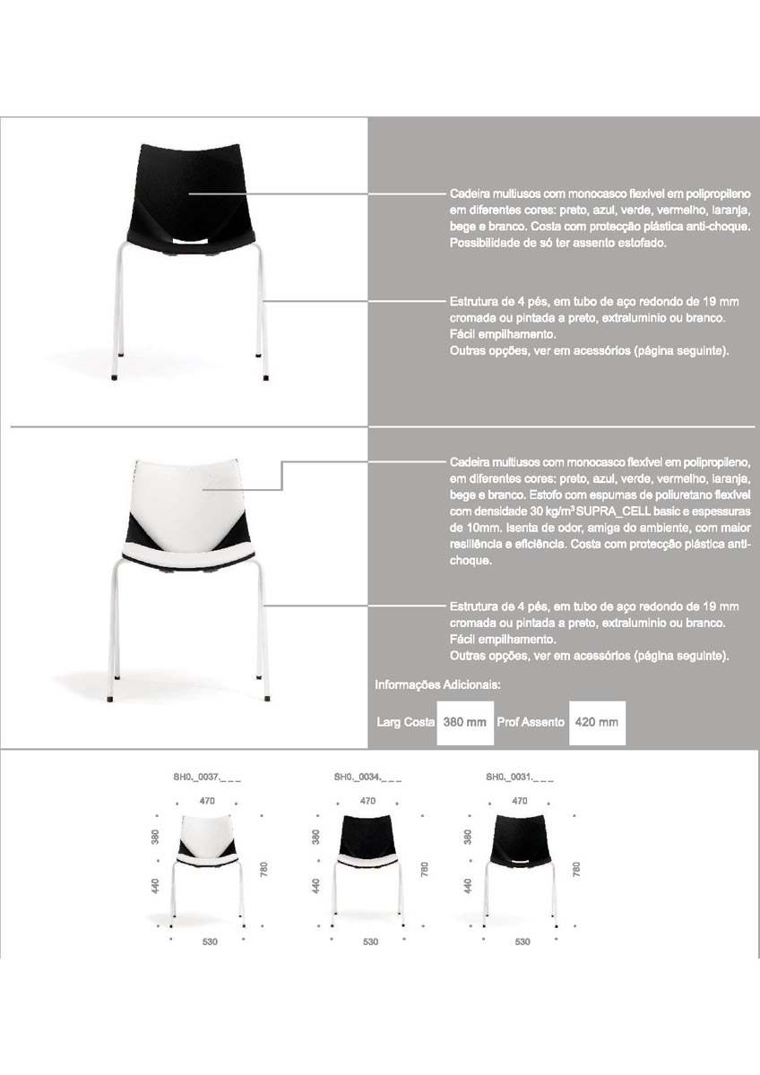 Empilhável, com e sem braços. Estrutura em tubo de aço redondo polido, pintado a epóxi ou cromado. A gama de cores disponível permite criar a atmosfera desejada, desde um ambiente sóbrio a uma vibrante criatividade.